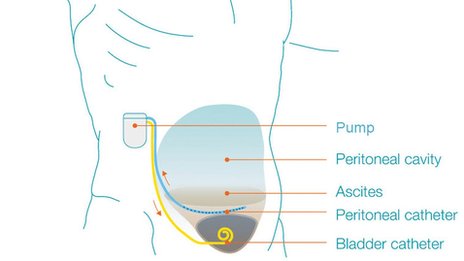 The pump siphons off excess fluid that can build up in the abdomen after liver failure and diverts it to the bladder so it can be urinated out.